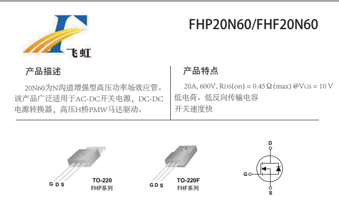 FHP20N60的主要封裝形式是TO-220、TO-220F、TO-3PN,腳位排列位GDS。這款20N60場效應(yīng)管產(chǎn)品具體參數(shù):Vgs(±V):30;VTH(V):3-5;ID(A):20;BVdss(V):600。RDS (on) = 0。45mΩ(typ)@V GS =10V。