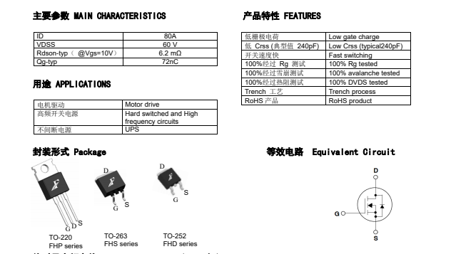 FHP60N1F10A具有60A、100V, RDS(on) = 12mΩ(max) @VGS =±20 V,具備100% EAS測試,UPS不間斷電源電路用mos管100% Rg測試,電機驅動用mos管100% DVDS測試,極低的FOM(RDSON*Qg),極低的輸入電容的特點。