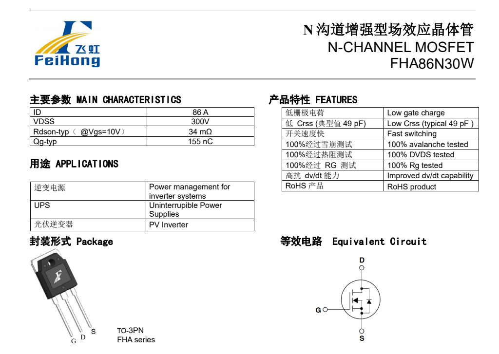 綜合以上的產品參數,3000W戶外儲能電源逆變模塊的全橋逆變電路除選用Fda59N30場效應管外,還可以用飛虹半導體的國產型號:FHA86N30W型號參數來代換。